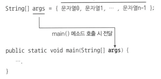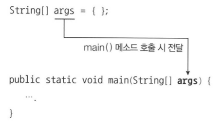 - 문자열 목록으로 구성된 String[] 배열이 생성되고 main() 메소드를 호출할 때 매개 값으로 전달된다.
